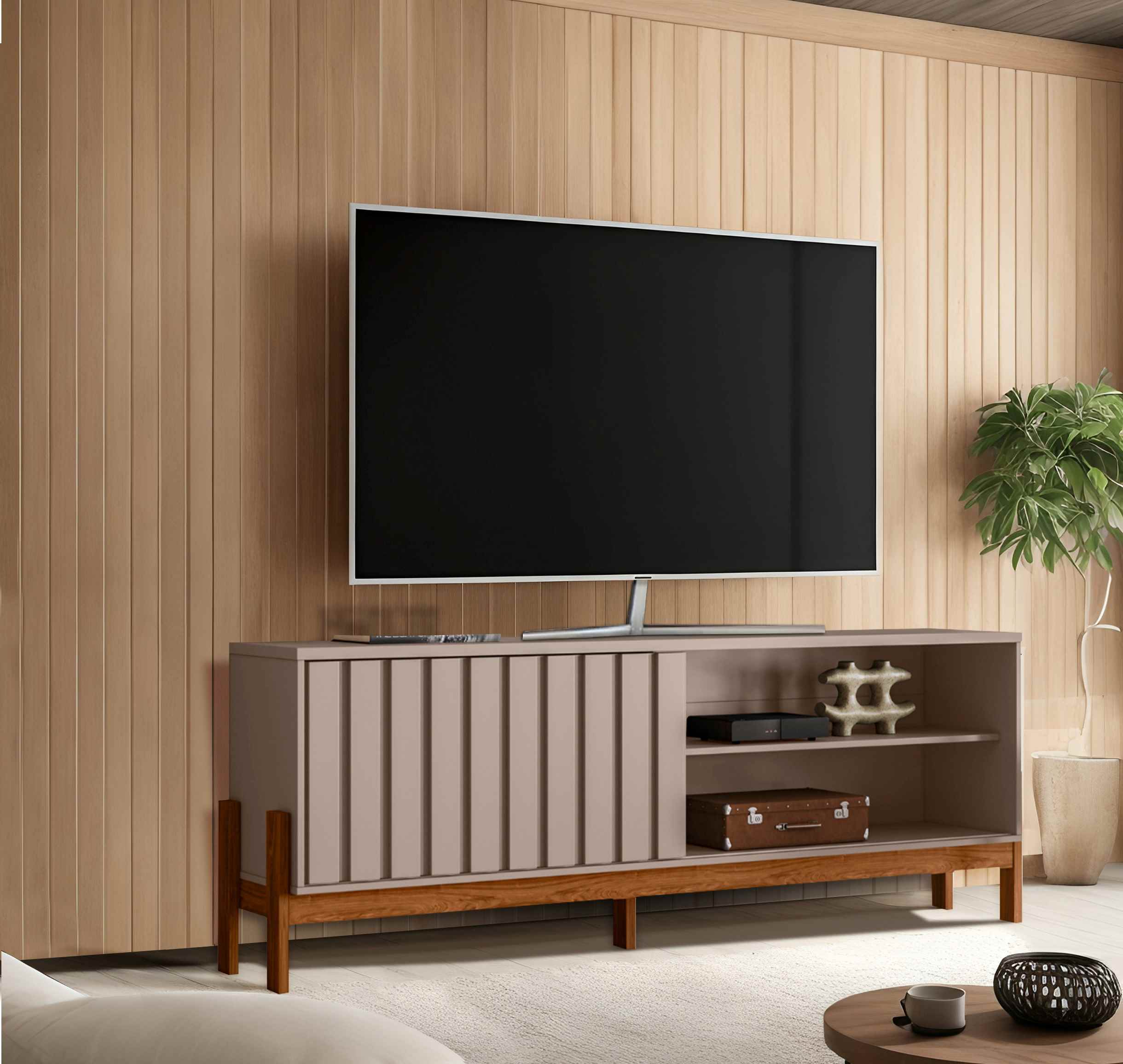 Medidas: Alt 0,715m Larg 1,88m Prof 0,36m Peso 36,75Kg - 1 Volume - Estrutura 100% MDP 12mm e 15mm, Tampo de 25mm, 1 Porta Ripada Deslizante com Roldanas Metálicas, 2 Nichos Externos Divididos por Prateleira de MDP 15mm, Pés de MDP 25mm, Acabamento em Pintura UV Fosco e Semi-Brilho.
