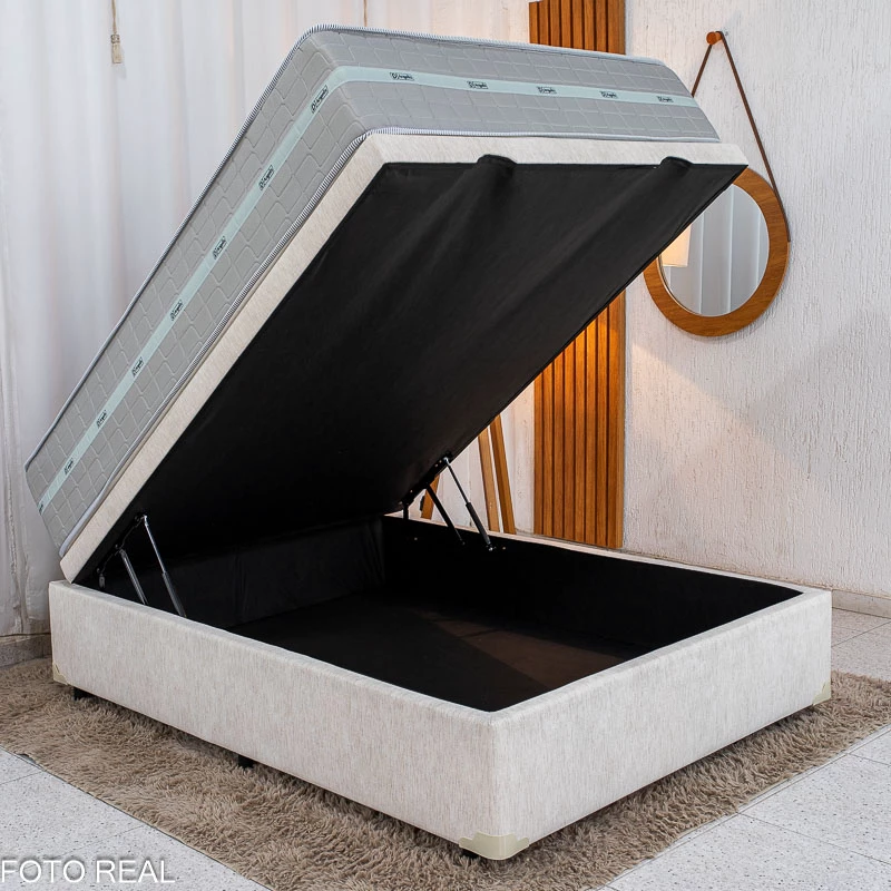 A base box em madeira de eucalipto ecológica é revestida em Korino Linho, com pés de 7?cm, base blindada e articulação com pistões, garantindo amplo espaço interno e suporte de até 130?kg por pessoa. Ideal para quem busca conforto, durabilidade e qualidade em um único conjunto.