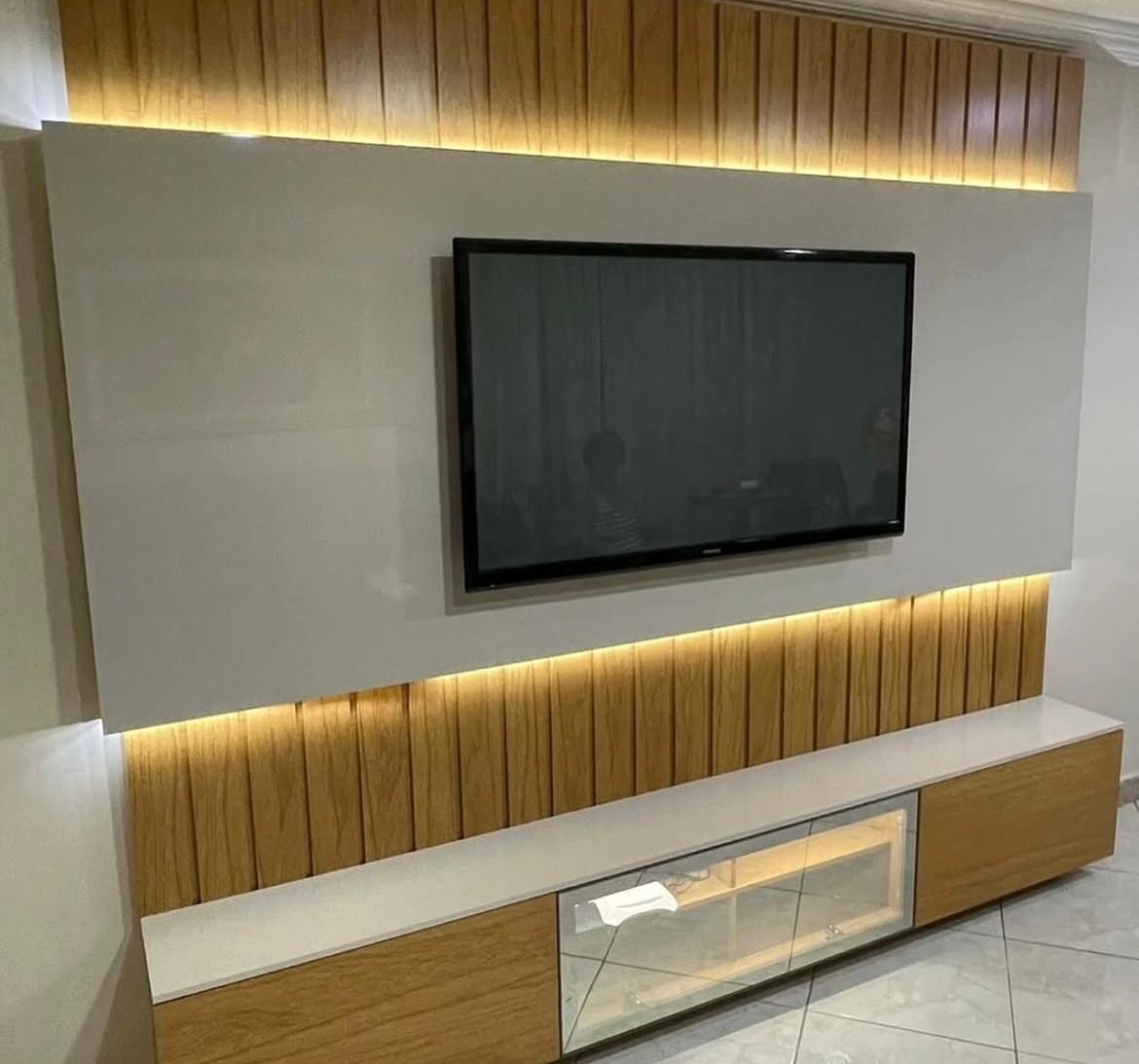 - Estrutura 100% MDF 15mm e 18mm, Paineis Superiores e Inferiores com Detalhe Ripado Autêntico e o Painel Central Liso Sobreposto com Efeito Flutuante e LEDs de Iluminação Quente nas Bordas, Bancada Suspensa com Amplo Espaço para Objetos Decorativos, 3 Portas de Bater com Dobradiças Metálicas e Pistão a Gás, sendo a Porta Central com Vidro Reflecta e LED de Iluminação Quente, todas com Sistema de Toque Magnético "Push to Open", Acabamento com Pintura UV Fosco/Semi-Brilho. Suporte para até 75Kg e Espaço para TVs até 85 Polegadas.