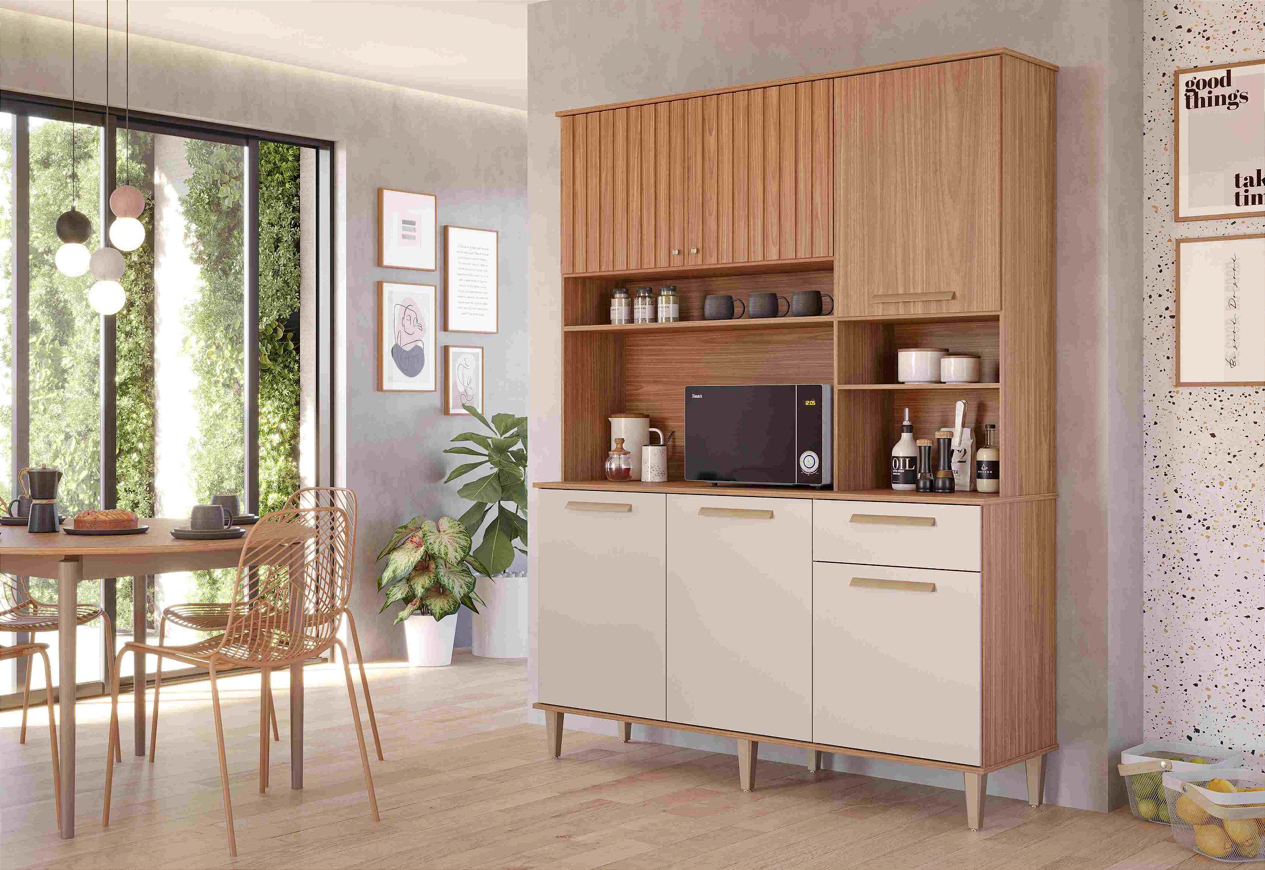 Estrutura 100% MDF 12mm e Chapa do Fundo de HDF 0,03m, 6 Portas de Bater com Dobradiças Metálicas Slow Motion, sendo as 2 Superiores com Detalhe Ripado, 1 Gavetas com Corrediças Telescópicas, 1 Prateleira Interna, 4 Nichos Externos para Eletrodomésticos, Louças e Utensílios Domésticos, Puxadores ABS, Pés Plásticos Reguláveis de PVC e Acabamento em Pintura UV Fosco/Semi-Brilho.