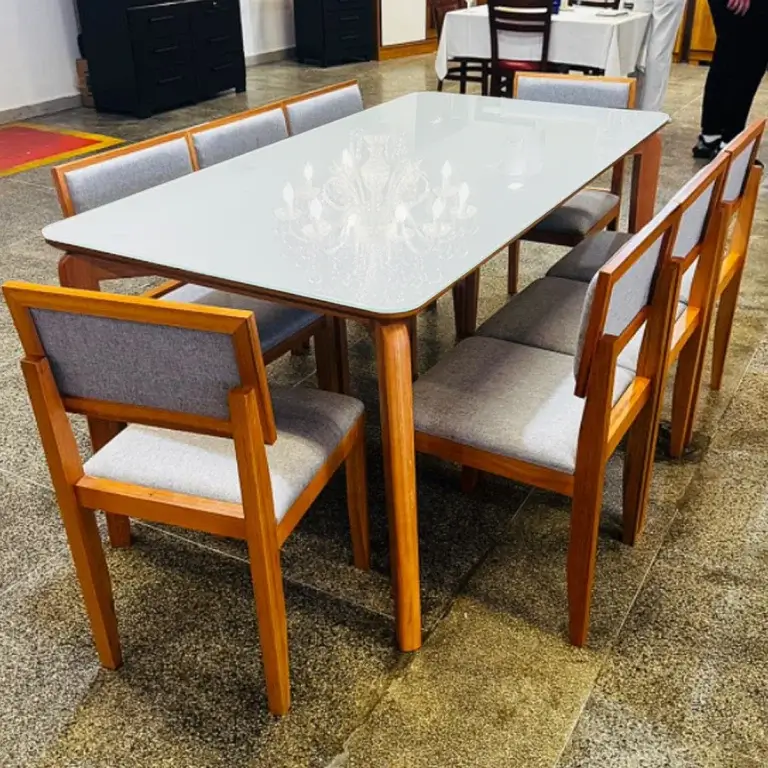 Mesa de Jantar Veneza Vidro180x90cm com 8 Cadeiras Santorini Estofadas Madeira Tecido Linho Minas Placpr