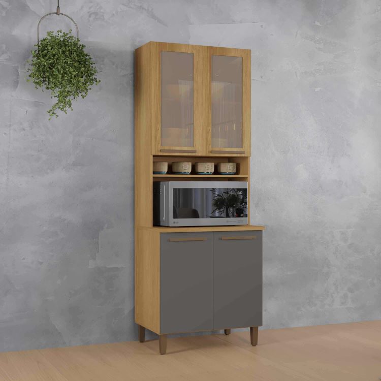 Mediudas: Alt 2,17m Larg 0,70m Prof 0,50m Peso 47,40Kg - Estrutura 100% MDP 15mm e Tampo MDP 25mm, 4 Portas de Bater com Dobradiças Metálicas, sendo 2 Superiores com Vidro Reflecta, 2 Prateleiras Internas 1 Nicho para Utensílios Domesticos e 1 Nicho para Forno com as Seguintes Medidas: Alt 0,345m Larg 0,665m Prof 0,30m, Puxadores de MDF, Pés Plásticos de PVC Reguláveis e Acabamento em Pintura UV Semi-Brilho.
